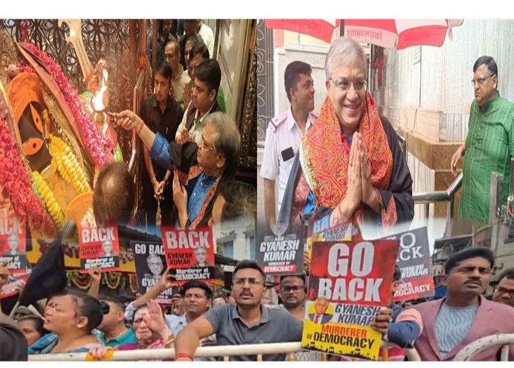 রবিবার রাতে কলকাতায় পা রাখা থেকে গো ব্যাক স্লোগান আর বিক্ষোভের মুখে পড়তে হয়েছে দেশের মুখ্য নির্বাচন কমিশনার জ্ঞানেশ কুমারকে। রবিবার রাতে নির্বাচন কমিশনের ফুল বেঞ্চ কলকাতায় আসার পর সোমবার রয়েছে ঠাসা কর্মসূচি।দফায় দফায় রাজ্য প্রশাসন, বিভিন্ন রাজনৈতিক দলের সঙ্গে বৈঠক রয়েছে কমিশনের ফুল বেঞ্চের।রাজ্যে তিন দিনের সফরে এসেছেন জ্ঞানেশ। ফুল বেঞ্চের সঙ্গে রয়েছেন আরও দুই নির্বাচন কমিশনার সুখবীর সিংহ সান্ধু এবং বিবেক জোশী। সোমবার সকাল ১০টা নাগাদ রাজনৈতিক দলগুলির সঙ্গে তাঁদের বৈঠক হবে। এর পর প্রশাসনের সঙ্গেও বৈঠক রয়েছে। রাজ্যের মুখ্যসচিব, পুলিশপ্রধান সহ অন্য শীর্ষ আধিকারিকদের সঙ্গে বৈঠকে বসবে কমিশন।তবে তার মধ্যেই রবিবার রাতে কালো পতাকা,বিক্ষোভের রেশ কাটিয়ে সোম সকালে কালীঘাট মন্দিরে পুজো দিতে গিয়েছিলেন জ্ঞানেশ।সেখানেও বিক্ষোভের মুখে পড়তে হল তাঁকে।জ্ঞানেশকে ঘিরে ধরে এক দল বিক্ষোভকারী কালো পতাকাও দেখালেন বলে খবর। ফের উঠল ‘গো ব্যাক’ স্লোগানও। তবে কলকাতায় পা রাখার পর থেকেই বিক্ষোভের সম্মুখিন হয়েও কোনও মন্তব্যই করতে চাননি জ্ঞানেশ। মন্দিরে পুজো দিয়ে বেরিয়ে গিয়েছেন তিনি।তাঁর সঙ্গে ছিলেন রাজ্যের মুখ্য নির্বাচনী আধিকারিক মনোজকুমার আগরওয়াল ও।সূত্রের খবর তাঁদের কালীঘাট পৌঁছোনোর আগে থেকেই মন্দিরের সামনে বিক্ষোভ চলছিল। কালো পতাকা হাতে জ্ঞানেশের বিরুদ্ধে এবং নির্বাচন কমিশনের বিরুদ্ধে স্লোগান তুলছিলেন অনেকেই। অভিযোগ একটাই।এসআইআর করার মধ্যে দিয়ে ভোটার তালিকা থেকে অযথা নাম বাদ দিয়ে দেওয়া হয়েছে।তবে জ্ঞানেশকে ঘিরে ধরে বিক্ষোভ দেখানো হলেও সেই বিক্ষোভ কারীদের মধ্যে দিয়েই মন্দিরে প্রবেশ করেন জ্ঞানেশ। আর পুজো দিয়ে পশ্চিমবঙ্গের সকল মানুষকে ভাইবোন সম্বোধন করে নমস্কার জানিয়ে সকলের মঙ্গল কামনা করেন। বিক্ষোভ নিয়ে প্রশ্ন করা হলেও কোনও মন্তব্য করতে চাননি কমিশনার। গাড়িতে উঠে তড়িঘড়ি মুখ্যমন্ত্রীর পাড়া ছাড়েন তিনি।রাজনৈতিক মহলের মতে রবি রাত থেকে কালো পতাকা আর বিক্ষোভের সঙ্গে তিনি নিজেকে আত্মস্থ করেছেন।তবে কমিশন সূত্র বলছে পুজো দিয়ে জ্ঞানেশ বলেছেন, ‘‘এ বার শুধু নির্ভয় নির্বাচনের পর্ব হবে। ’কালীঘাটের পাশাপাশি বেলুড় মঠেও যেতে পারেন জ্ঞানেশ বলে খবর।