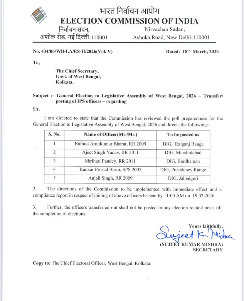 ভোটের আগে প্রশাসনিক বড় রদবদল, ৫ জেলায় নতুন ডিআইজি,কড়া বার্তা নির্বাচন কমিশনের