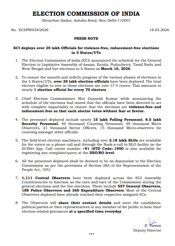 দেশের চার রাজ্য ও একটি কেন্দ্রশাসিত অঞ্চলে আসন্ন বিধানসভা নির্বাচন ঘিরে নজিরবিহীন প্রস্তুতি নিল নির্বাচন কমিশন। অবাধ ও শান্তিপূর্ণ ভোট নিশ্চিত করতে মোট ২৫ লক্ষেরও বেশি কর্মী মোতায়েন করা হচ্ছে।একই সঙ্গে কমিশনের চোখ এবং কান হিসেবে কাজ করবেন ১,১১১ জন কেন্দ্রীয় পর্যবেক্ষক।গত ১৫ মার্চ দিল্লিতে নির্বাচনের নির্ঘণ্ট ঘোষণা করে কমিশন জানায় পশ্চিম বঙ্গ সহ অসম, কেরল, তামিলনাড়ু ও পুদুচেরীতে মোট ৮৩২টি বিধানসভা কেন্দ্রে ভোটগ্রহণ হবে। পশ্চিমবঙ্গে ভোট হবে দু’দফায়।২৩ এপ্রিল ও ২৯ এপ্রিল। সব রাজ্যের ফল প্রকাশ হবে ৪ মে।কমিশনের তথ্য অনুযায়ী, মোট ভোটার সংখ্যা ১৭ কোটি ৪০ লক্ষের বেশি। এই বিপুল নির্বাচনী প্রক্রিয়া সামলাতে প্রতি ৭০ জন ভোটারের জন্য গড়ে একজন কর্মী রাখা হয়েছে।যা নজিরবিহীন প্রশাসনিক প্রস্তুতির ইঙ্গিত দিচ্ছে বলেই মত রাজনৈতিক মহলের।নিযুক্ত কর্মীদের মধ্যে রয়েছেন প্রায় ১৫ লক্ষ ভোটকর্মী, সাড়ে ৮ লক্ষ নিরাপত্তারক্ষী, ৪০ হাজার গণনাকর্মী, ২১ হাজার সেক্টর অফিসার এবং ৪৯ হাজার মাইক্রো অবজ়ার্ভার। গণনার জন্য অতিরিক্ত ১৫ হাজার মাইক্রো অবজ়ার্ভার রাখা হয়েছে। পাশাপাশি বুথ স্তরে ভোটারদের সহায়তায় থাকবেন প্রায় ২ লক্ষ ১৮ হাজার বিএলও।সবচেয়ে গুরুত্বপূর্ণ ভূমিকা পালন করবেন ১,১১১ জন কেন্দ্রীয় পর্যবেক্ষক। এঁদের মধ্যে ৫৫৭ জন সাধারণ পর্যবেক্ষক। ১৮৮ জন পুলিশ পর্যবেক্ষক এবং ৩৬৬ জন ব্যয়ের হিসাব পর্যবেক্ষণ করবেন। ইতিমধ্যেই অধিকাংশ পর্যবেক্ষক নিজ নিজ কেন্দ্রে পৌঁছে কাজ শুরু করেছেন বলেও খবর।কমিশন জানিয়েছে, নির্দিষ্ট সময়ে প্রার্থী বা রাজনৈতিক দলের প্রতিনিধিরা সরাসরি এই পর্যবেক্ষকদের সঙ্গে যোগাযোগ করতে পারবেন এবং ভোট সংক্রান্ত অভিযোগ জানাতে পারবেন।মুখ্য নির্বাচন কমিশনার জ্ঞানেশ কুমার স্পষ্ট করে জানিয়েছেন, ভোটারদের নিরাপদ ও নির্ভয় পরিবেশে ভোটদান নিশ্চিত করাই কমিশনের প্রধান লক্ষ্য। সেই লক্ষ্যেই এই বিশাল কর্মী বাহিনী ও কড়া নজরদারির ব্যবস্থা করা হচ্ছে।সব মিলিয়ে ,এবারের নির্বাচন শুধু সংখ্যার দিক থেকেই নয়, প্রস্তুতি ও পর্যবেক্ষণের দিক থেকেও এক নতুন মানদণ্ড স্থাপন করতে চলেছে।এখন দেখার বিষয় এত আঁটোসাটো প্রস্তুতির পর কমিশন কতটা সুষ্ঠ এবং শান্তিপূর্ণভাবে ভোটগ্রহণ প্রক্রিয়া সম্পন্ন করতে পারবে।